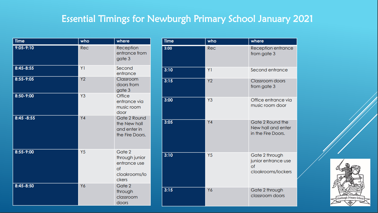 Please take note of changes to entry and exit times and keep strictly to times. Please help us to keep everyone as safe as possible by wearing a face covering and not congregating and conversing with other on or just outside the school grounds.